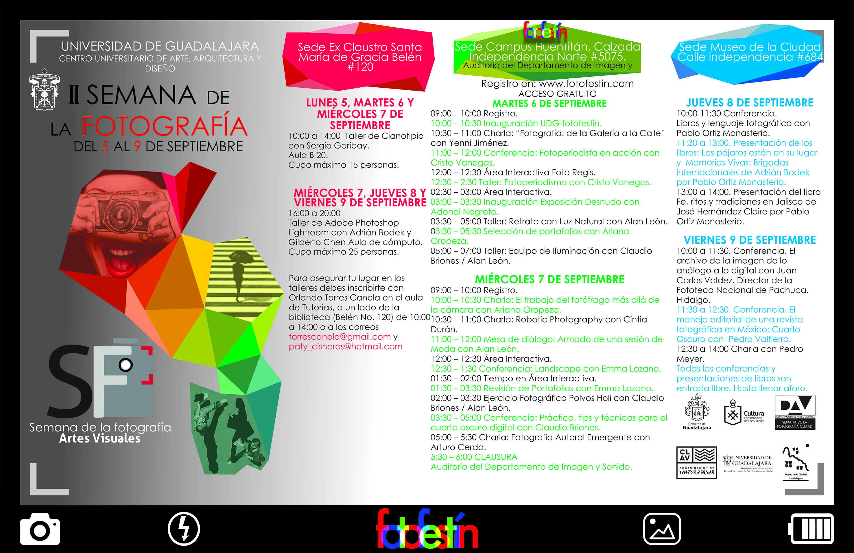 Después nos vamos con todo el 6 y 7 de septiembre en el Centro Universitario de Arte, Arquitectura y Diseño (CUAAD) sede Huentitán. A lo largo de ambos días contaremos con la presencia de ponentes como Cristo Vanegas fotoperiodista ganador en el World Press Photo 2014, Emma Lozano NPS Nikon, Cintia Durán Directora de Generador Proyectos Fotográficos, Alan León, fotógrafo de moda, Claudio Briones, nuestro Coordinador de Fotografía y Ariana Oropeza, Directora de fotofestín.